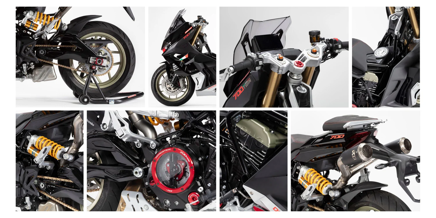 Más allá de su pintura personalizada, la Dragster 700 Twin Factory Limited Edition cuenta con algunos de los mejores componentes de la industria, incluidas piezas de Öhlins, Brembo, Akrapovič, Marzocchi y DBK.
